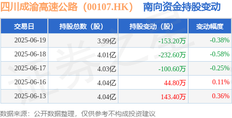 本站消息,6月19日南向资金减持153.2万股四川成渝高速公路(00107.HK)。近5个交易日中,获南向资金减持的有3天,累计净减持298.2万股。近20个交易日中,获南向资金增持的有15天,累计净增持468.28万股。截至目前,南向资金持有四川成渝高速公路(00107.HK)3.99亿股,占公司已发行普通股的44.57%。